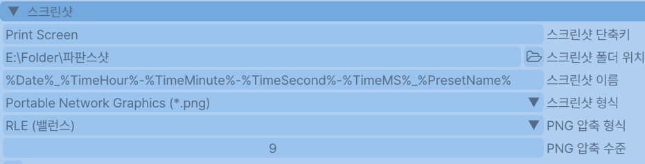 Gshade 패널 상단 설정 > 스크린샷 > 스크린샷 형식 > JPEG가 아닌 PNG 형식 선택