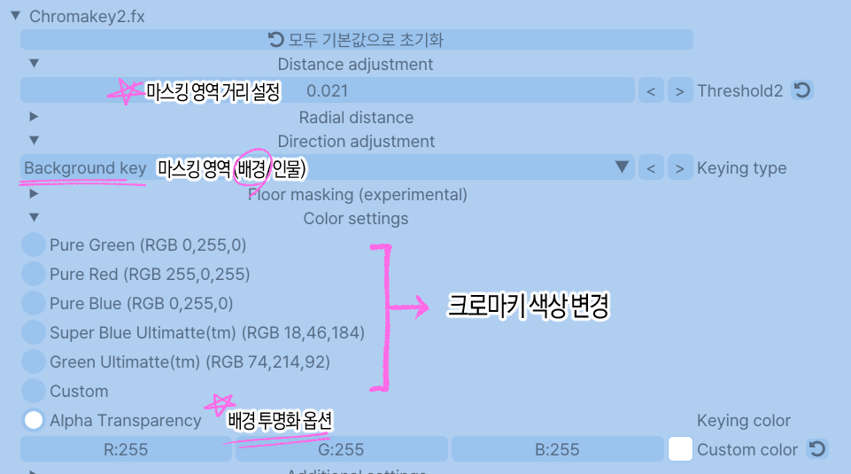 크로마키를 활성화하면 아마 이런 창이 뜨게 될 텐데요. 기능을 몇 가지 설명해 드리겠습니다.
