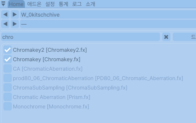 먼저, Gshade 패널 내 검색 기능으로 Chromakey를 검색한 뒤 활성화합니다.